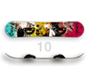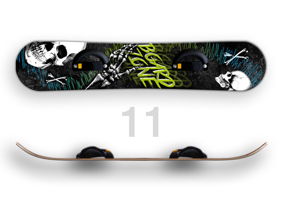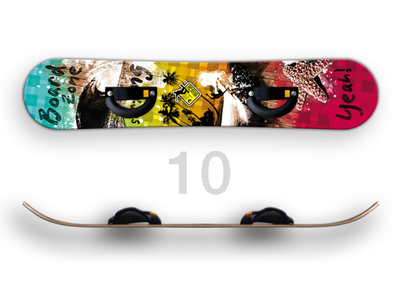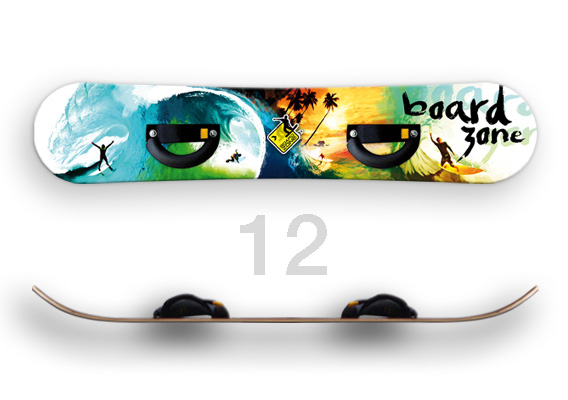 Fabricadas en terciado de Guatambú. Con laminado plástico (Fórmica) en su base para un óptimo deslizamiento. Las fijaciones de los pies son ajustables, con velcro y talonera elástica acolchada. Sujetas a la tabla por medio de insertos metálicos. Terminación: gráfica protegida con laca.